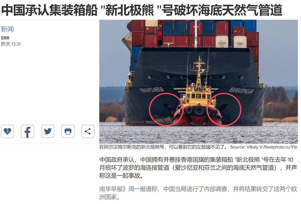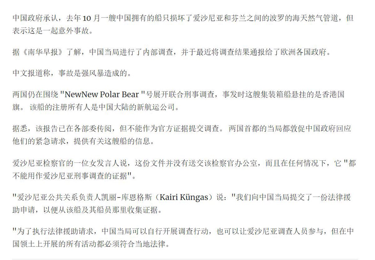 最新消息:8月12日,据《南华早报》报道,中国政府承认了2023年10月破坏芬兰和爱沙尼亚之间的波罗的海天然气管道的是一艘中国船只,表示是一场意外。 https://t.co/9SnOLjs9Eo