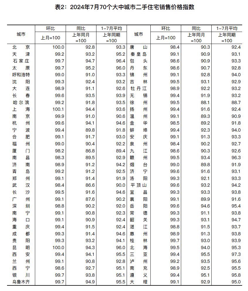 70个城市中新建和二手价格环比下降城市分别有66个和67个(6月分别为64和66个)。