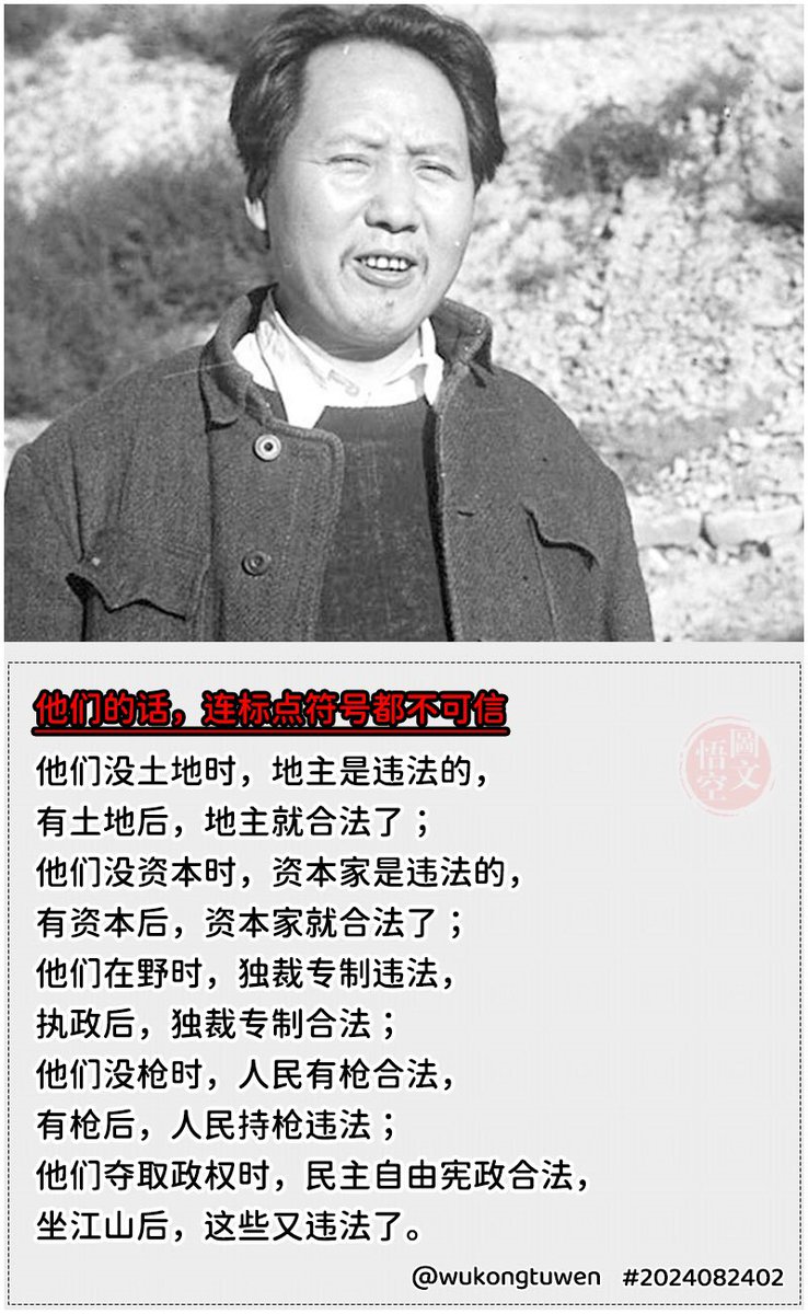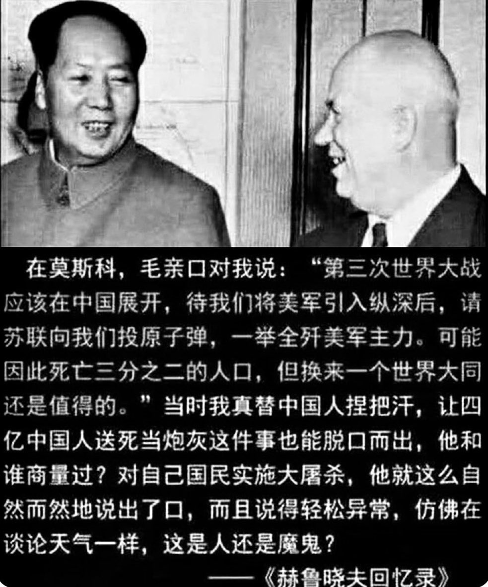 赫鲁晓夫说:“毛泽东不是疯子,它比希特 勒、斯大林更狡猾和残暴。他不承认任何法 律,谁不服,就砍掉谁的脑袋。他是亘古未有 天才杀人艺术家,这不是野蛮,而是野蛮的 爷爷。但是放心,毛泽东只会杀中国人!” https://t.co/AuS0P0Dkd0