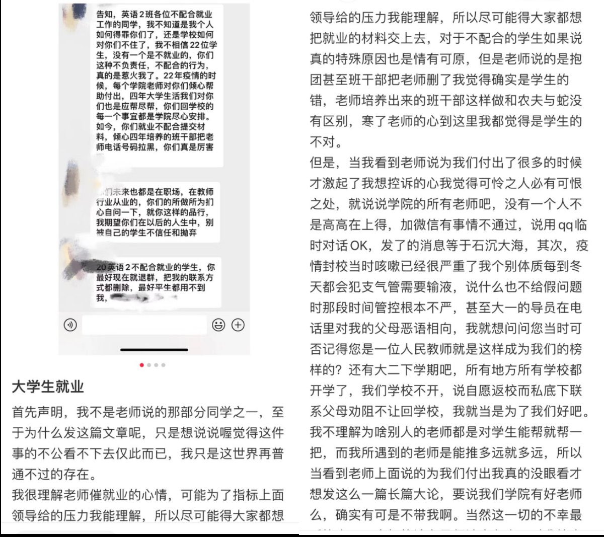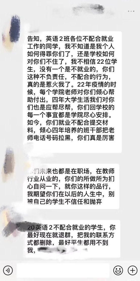 一名大学辅导员因为全班22名大学生全部没找到工作而崩溃,在班级群里破口大骂所有学生抱团和他作对。 https://t.co/h2yYehFjfe