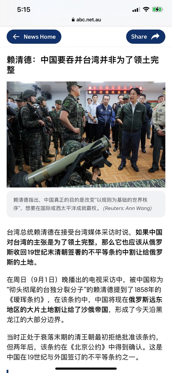 “中国不是为了领土完整才要吞并台湾,”赖清德说,“如果是为了领土完整,中国为什么不收回俄罗斯占据的、在《瑷珲条约》中割让的土地呢?俄罗斯现在正处于最弱的时候,不是吗?”