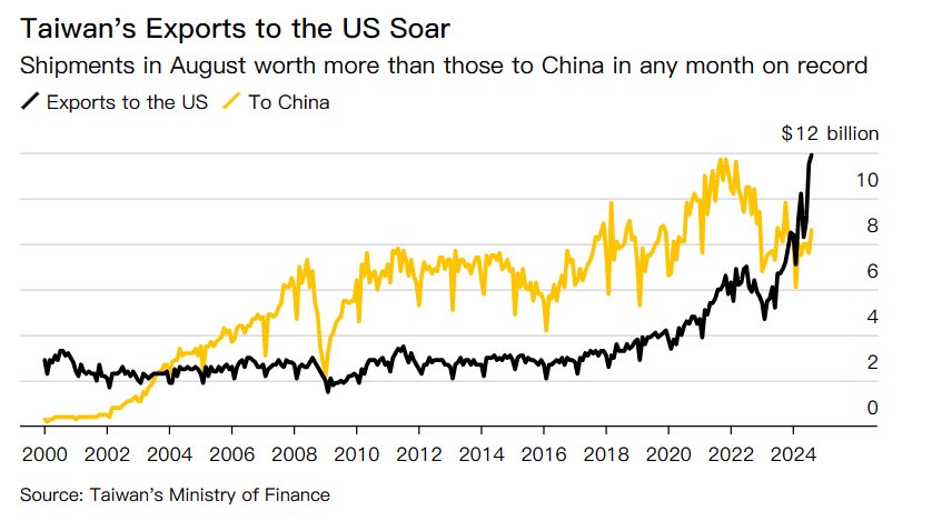 台湾8月出口总额创下历史纪录,达到436.4亿美元。对美国出口飙升至118.9亿美元,超过对中国的单月出口额纪录(2021年纪录为117.2亿美元)。 https://t.co/M93O8Px289