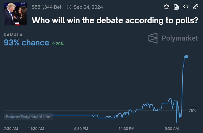最新消息:辩论即将结束,川普和哈里斯的辩论,“民意调查”显示,哈里斯辩论获胜的几率刚刚达到 95%。 https://t.co/M3KRFvZYW7