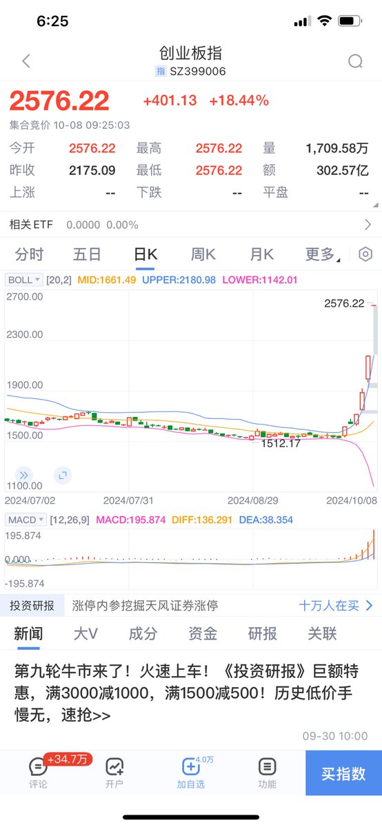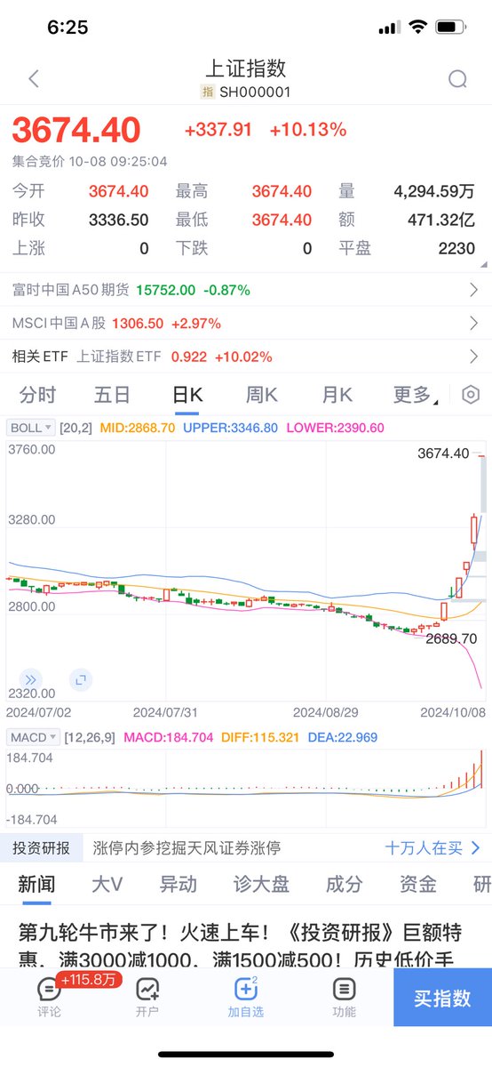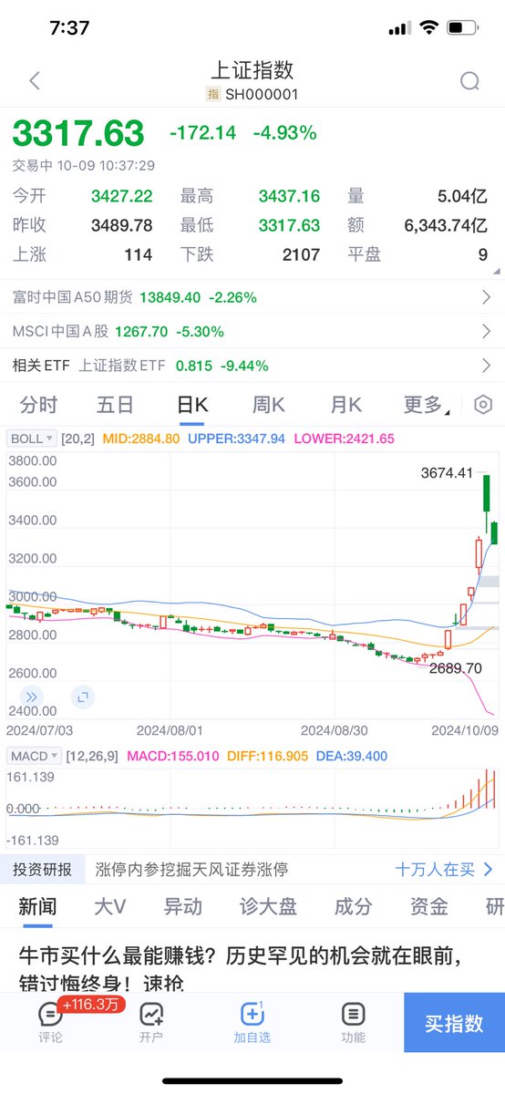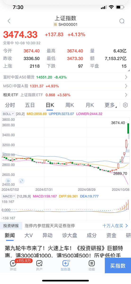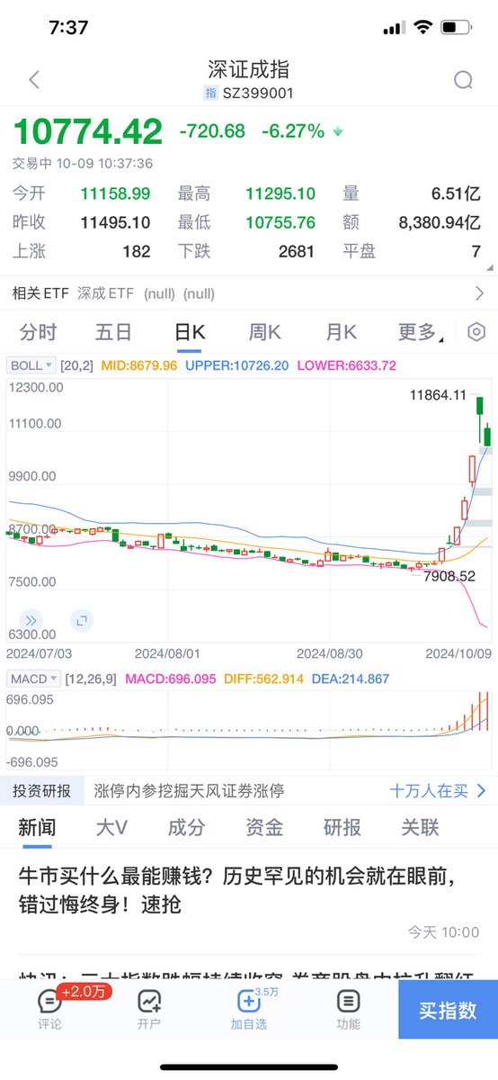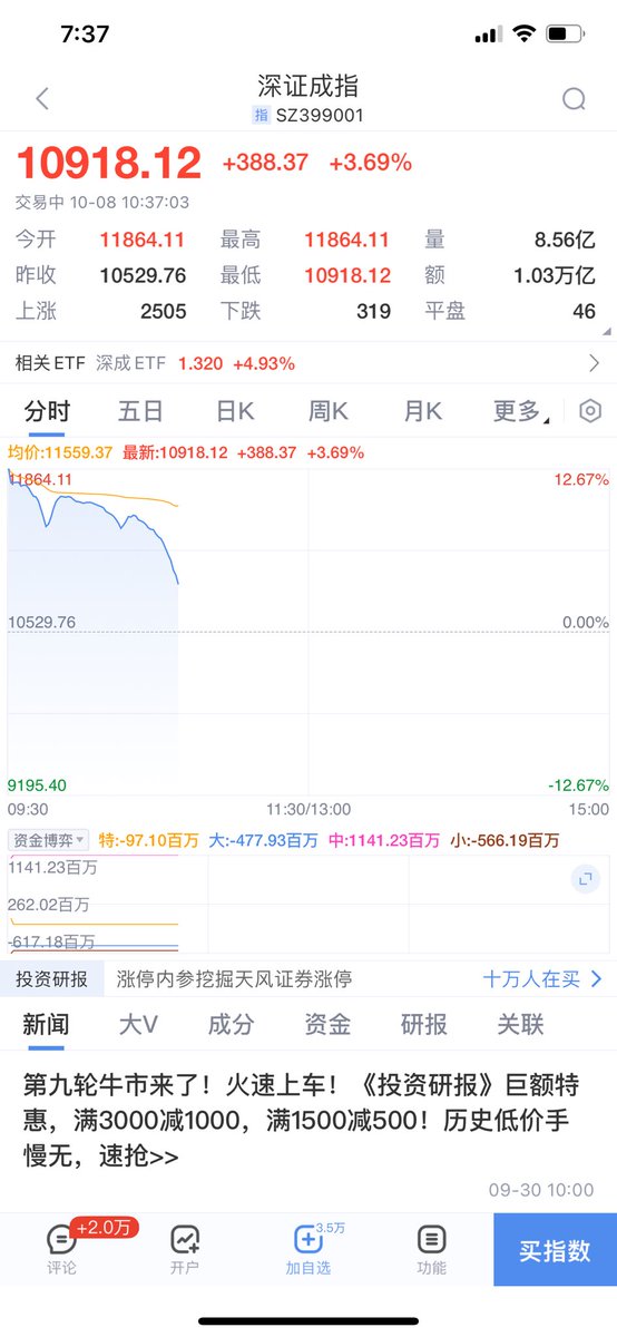 今天A股开盘暴涨,上证综指开盘上涨12%,之后大资金大幅抛售,盘中一度大跌11%,涨幅收窄到1%。典型的拉高出货走势,黄金周里很多砸锅卖铁入市的股民被套,惨不忍睹。