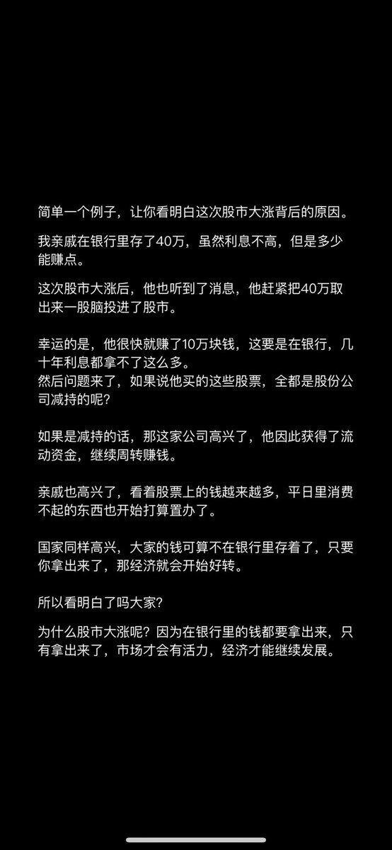 这次以印钞机拉抬股市,就是为了诱骗百姓的147万亿存款入市,替国资权贵资本接盘。本阶段目标基本达到,股灾式暴跌为期不远