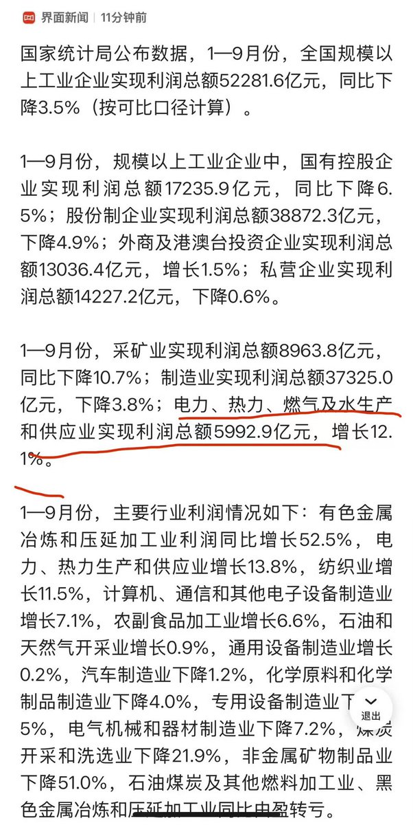 一方面是规模以上企业利润暴跌27%,另一方面是9月份水电气等垄断企业利润同比暴涨12%,可以理解为水电气价格暴涨12%。这样的基础物资如此暴涨,意味着中国的通胀大幅上涨!
