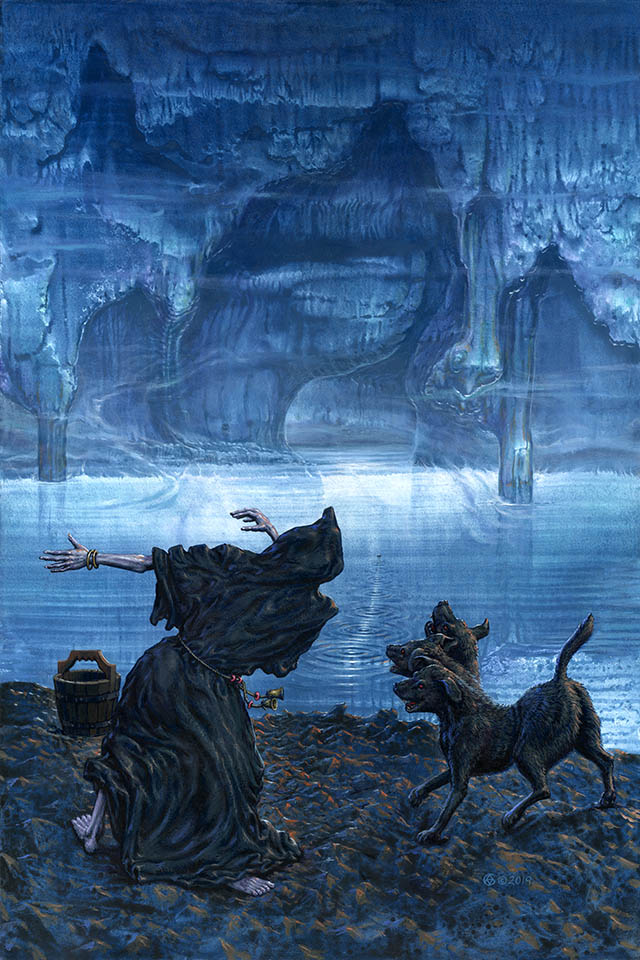 Hades dancing with Cerberus in the underworld.