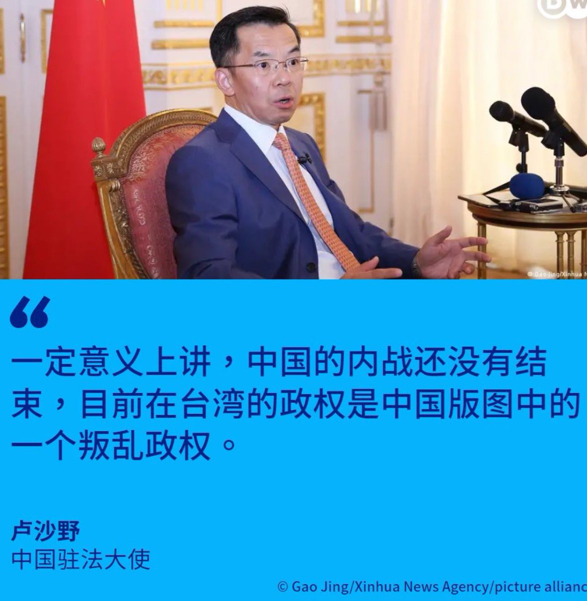 📣 转:中国驻法大使卢沙野近日竟在一个专题讨论会上宣称:中国内战尚未结束,目前台湾政权是一个叛乱政权。
