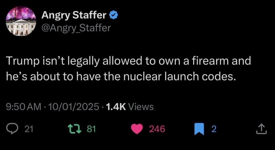 https://www.europesays.com/1759443/ Oval Office : Sorry Mr President turn over your guns, you aren’t allowed to own any guns, also here are the Nuclear Codes #PoliticalHumor #PoliticalHumor #Politics #USPolitics