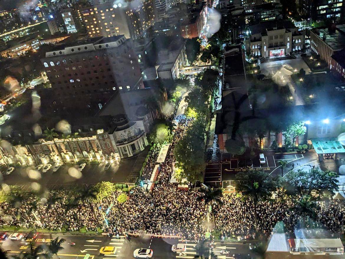 5月24日晚,台灣立法院外群眾聚集已超過10萬! 同樣的民眾集會在全台其他九個城市也在進行,據悉台南已超過萬人。從網絡上看到,不少年輕人說自己偏藍的家長不再像十年前(太陽花運動)那樣阻止;有中年人第一次出來參加;也有年輕人從1月份大選到現在政治轉向。