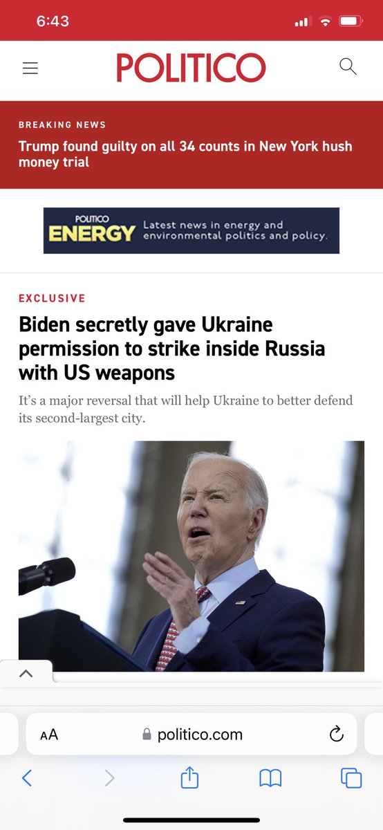 《政客》網站剛剛爆料,拜登秘密許可烏克蘭用美國給的武器打擊👊俄羅斯境內的目標。這算是一個重大升級吧。 https://t.co/I1I5ujacC7