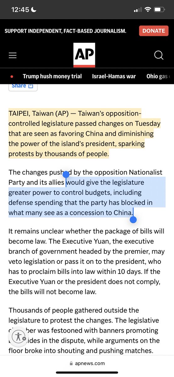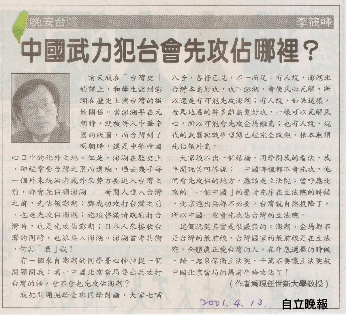 這是23年前的李筱峰的一篇評論文章,和剛剛5月28日的美聯社的一篇報導。前者指出中共攻台的第一線在立法院;後者也直言不諱地指出國會擴權法案將有利於中國(中共),因為削弱總統權力後,也將影響到國防開支。所以美聯社的報導也暗合「攻台第一線在立法院」的預言。
