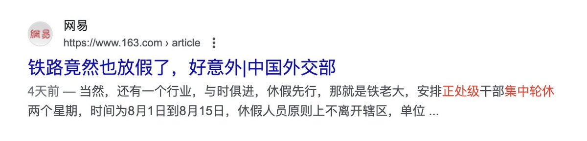 铁路部门的异常之处在于,7月1日至8月31日的两个月在中国被称为“暑运”。有学生的放假、暑假结束的返校、暑假期间的旅游这些安排,也是一年中铁路运输的高峰期。为什么这个时候安排中层干部集中休假呢?这条消息很诡异之处在于:这两天网上都在传,但我却查不到它的出处了。《网易》有一条消息,点开链接却显示404了。也就是说这条消息在墙内已经被删干净了,网易这条消息在Google上显示的摘要栏里说,轮休干部被要求不离开辖区,那也就是并不真的放大家去度假,而是随时待命。那“集中轮休”就很可能是以休假为名,让干部们暂时离开岗位,从效果上讲,就是正处级干部短暂的集体调离。是什么动机让人非常费解,也请对这个体系有了解的朋友在评论区留言。按我放飞头脑、思绪飞扬的习惯,我第一念想到的是:铁路系统出紧迫的状况,导致中层干部整体上被怀疑、不受信任。所谓集中轮休,有集中调离排查的意味,找出当中的出问题分子。