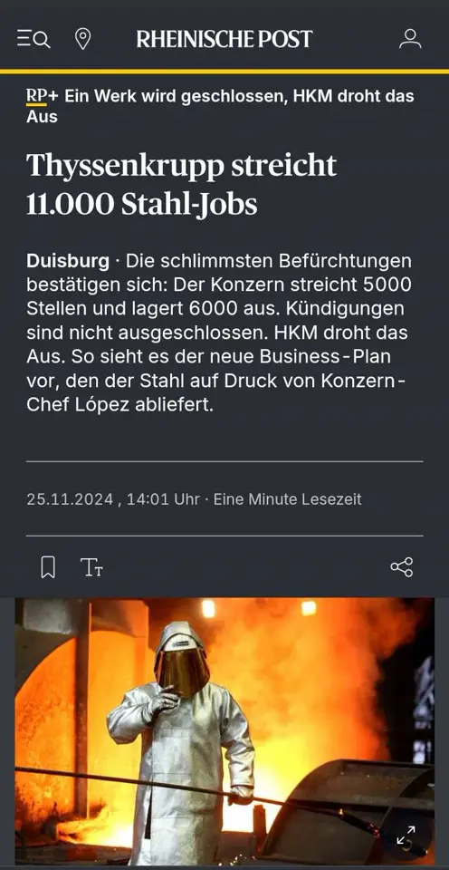 The scrapping of Germany continues. Now ThyssenKrupp is cutting 11000 jobs. The climate transformation is probably not going as well as the green socialists and rainbow stalinists thought it would! #Germany #wef #greendeal #recession https://files.sovbit.host/media/863f2c555276e9ed738933b0efee6b021042f16e1529dd755704885b87fee183/447d9dd89caee61f9cca71a3e48e689013fb78a990df2734f02a34ca759aa849.webp