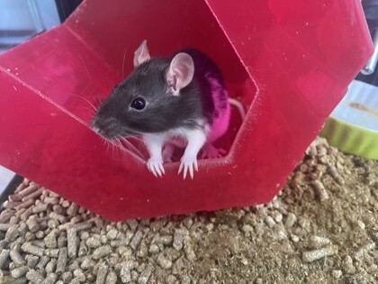 Patrick, one of the new boys. He has markings behind his ears like several of our other rats, but also has a cool pattern on his face. Patrick is small but powerful. He is about the same size as his brother Stanley, but they aren't dwarves, they're just small. We instantly fell in love with him and his brothers.