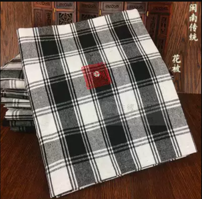 金门花帕是闽南地区独特的传统育婴包巾,在金门已有八百年历史。传统花帕是黑白格纹的棉麻大方巾,上绣有红卍字,缝有一对圆形的铅片,具有驱邪平安之意。花帕四个角分别缝有小红标,又称“四角虎”,有吉祥之意。