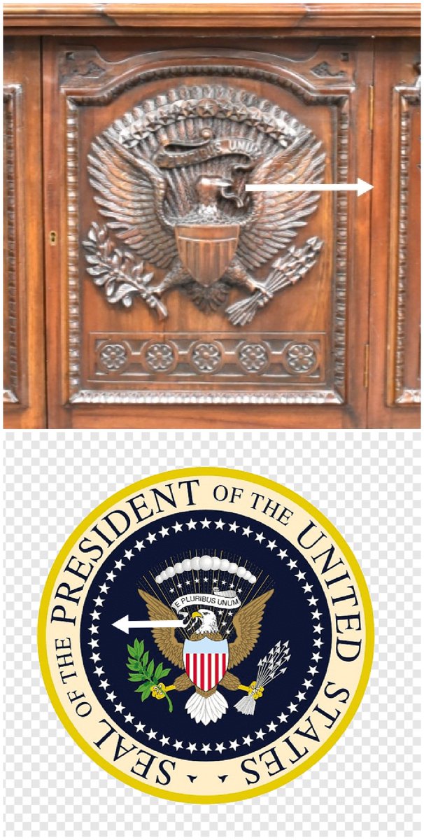 群友刚参观白宫(不能拍照)。说起来,那个出名的总统桌子,在后加的脚档板上,那个徽号其实是错体/非常规的: https://t.co/XUjR5RfEAy