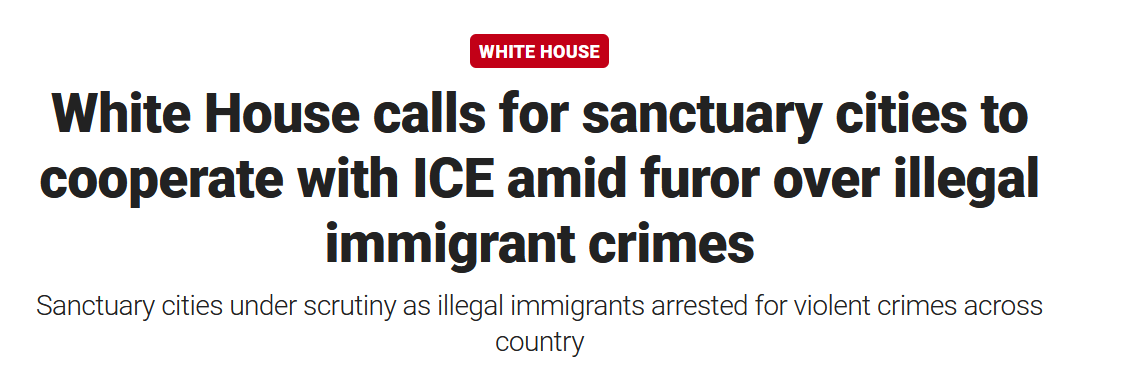白宫发言人在恳求庇护城政府配合移民局、交出非法移民罪犯(to cooperate with ICE in turning over criminal illegal immigrants for deportation),发言里特别提到庇护城在移民局请求下仍然坚持释放非法移民(illegal immigrants who had previously been released by local law enforcement despite pleas from ICE)。
