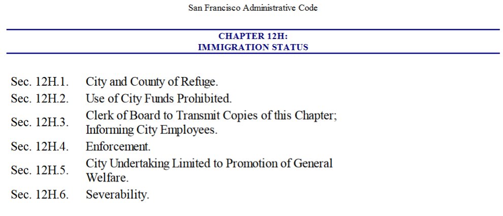 2013年,三藩市《庇护条例》立法,禁止市政府雇员为国家移民局提供非法移民信息。譬如说非法移民犯本地罪、在本地监狱服刑,而国家移民局要知道释放日期时间好来马上抓人,你一出监狱我就抓你驱逐离境,除非存在其他必须遵守的法律规定,否则,市政府雇员不能提供,而如果市政府官员提供,是犯法的!白纸黑字的《Sanctuary Ordinance》,够“阻扰”没有?
