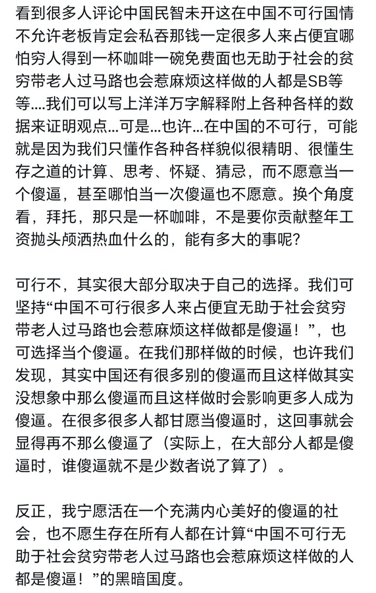 一次我在西藏,我要拉肚子疼死随时爆炸,守门老妇坚持1元,我拉完后,额外给了她10元,我预先付钱,请后面10人,让她后面10人不要收钱。这不是因为后面10人穷,也许他们比我有钱,甚至也许是马云肚子疼呢?关键不是在他们需要,关键是在random,随意,随手,任性。
