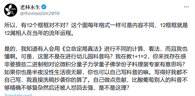 靠近年底,电视网络不是都有许多大师评论翌年各属相的流年运气吗?不懂的看起来好像很厉害很复杂,其实呢,开局一张图内容全靠编。知道了逻辑,你也是麦玲玲。 https://t.co/zhYoU9GihX
