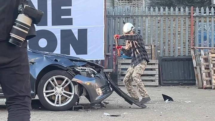https://www.europesays.com/uk/12545/ Tesla smashed to pieces in London protest against Elon Musk | News #Britain #England #GreatBritain #london #UK #UnitedKingdom
