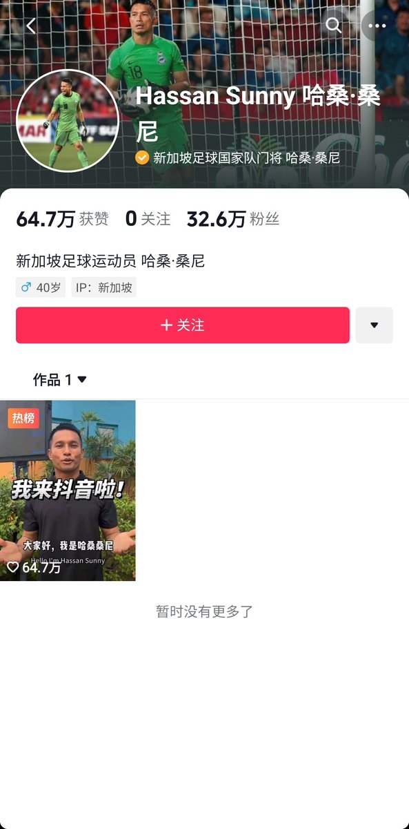 新加坡队门将哈桑·桑尼今天在抖音开设账号,第一天就有32.6万人关注,发了一个短视频,有64.7万个点赞👍。 https://t.co/ttuAJCQamM
