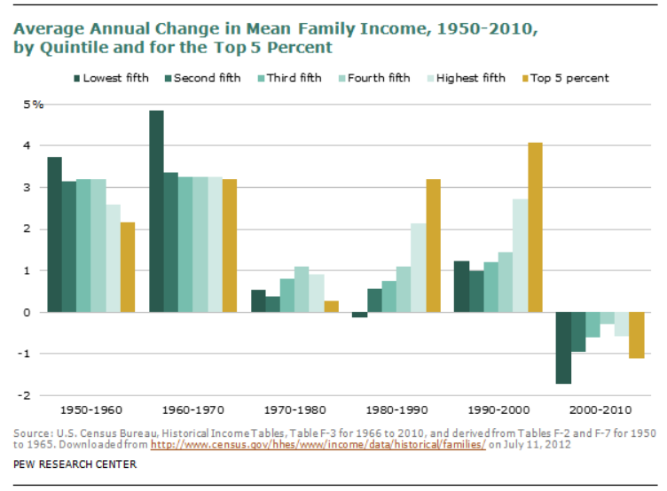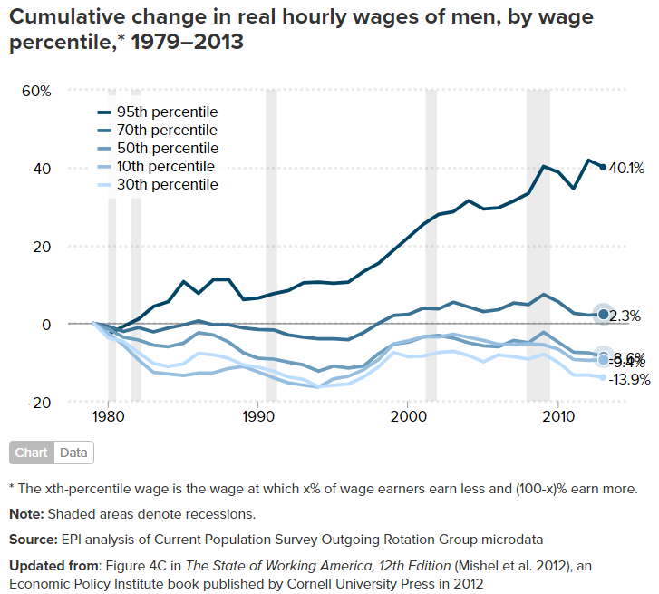 From 1979-2013, male workers below the 70th percentile experienced negative real (inflation adjusted) hourly wage growth.