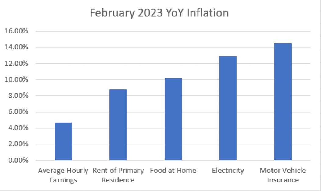 Real average hourly earnings decreased 1.3%, seasonally adjusted, from 2/22 to 2/23 (BLS).