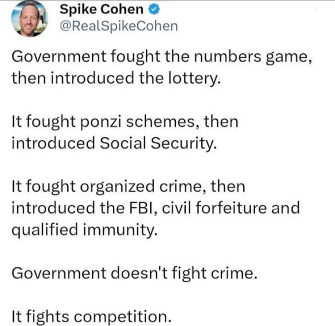 Had a sticker on my first car back in the 90s that read Dont Steal, the Government Hates Competition. And ironically, the government stole that very car from me through asset forfeiture after I was caught with over an arbitrary amount of a plant. And then to make matters worse, the PD started using it for undercover ops leaving all my stickers probably causing some people who recognized my car to think I was working with them. Fuck the state, and every single person working for it.