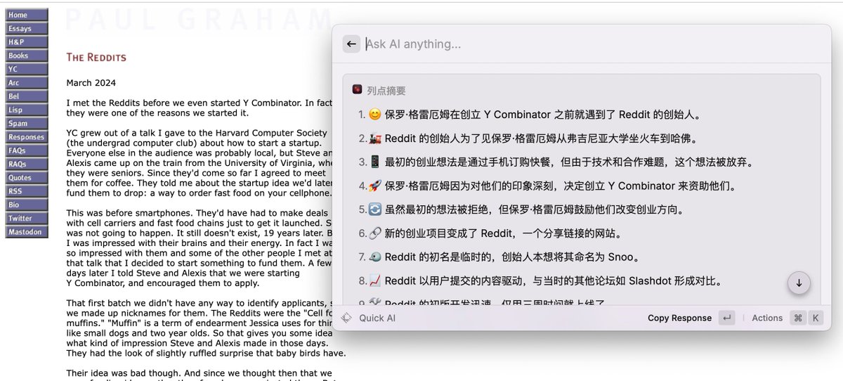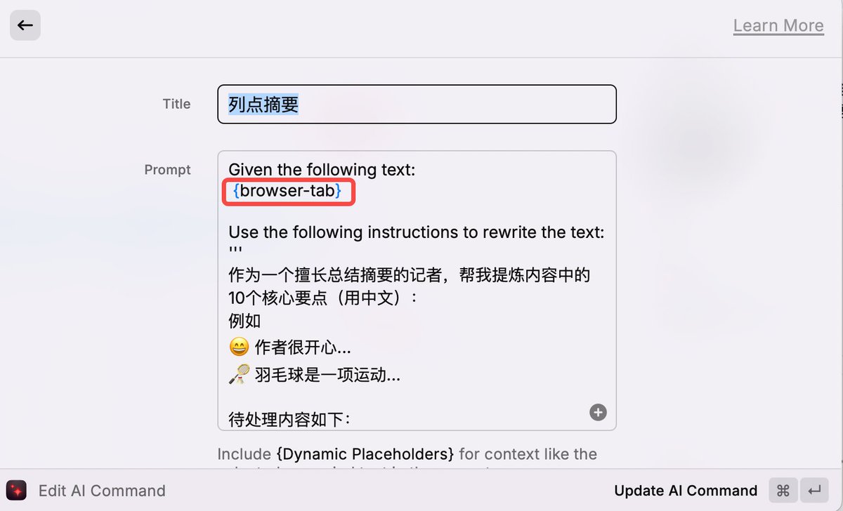 比如,想把当前页面内容发给Raycast做成列点摘要,Prompt如下: