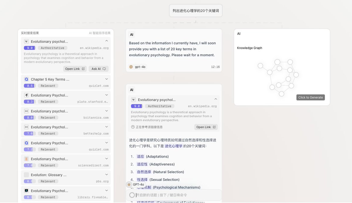 - 研究感兴趣的话题和知识,例如生成进化心理学的20个关键概念,从此开始下钻探索。