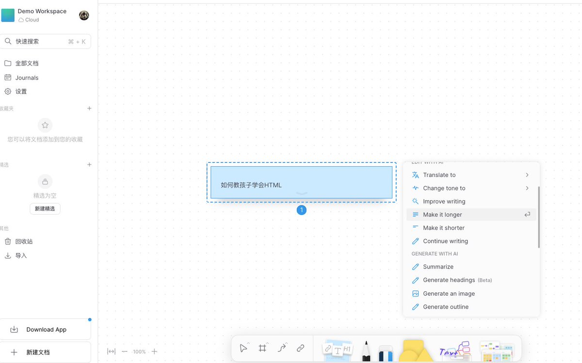 产品逻辑:借助白板和AI快速探索,生成有逻辑关系的内容卡片,分享传播。