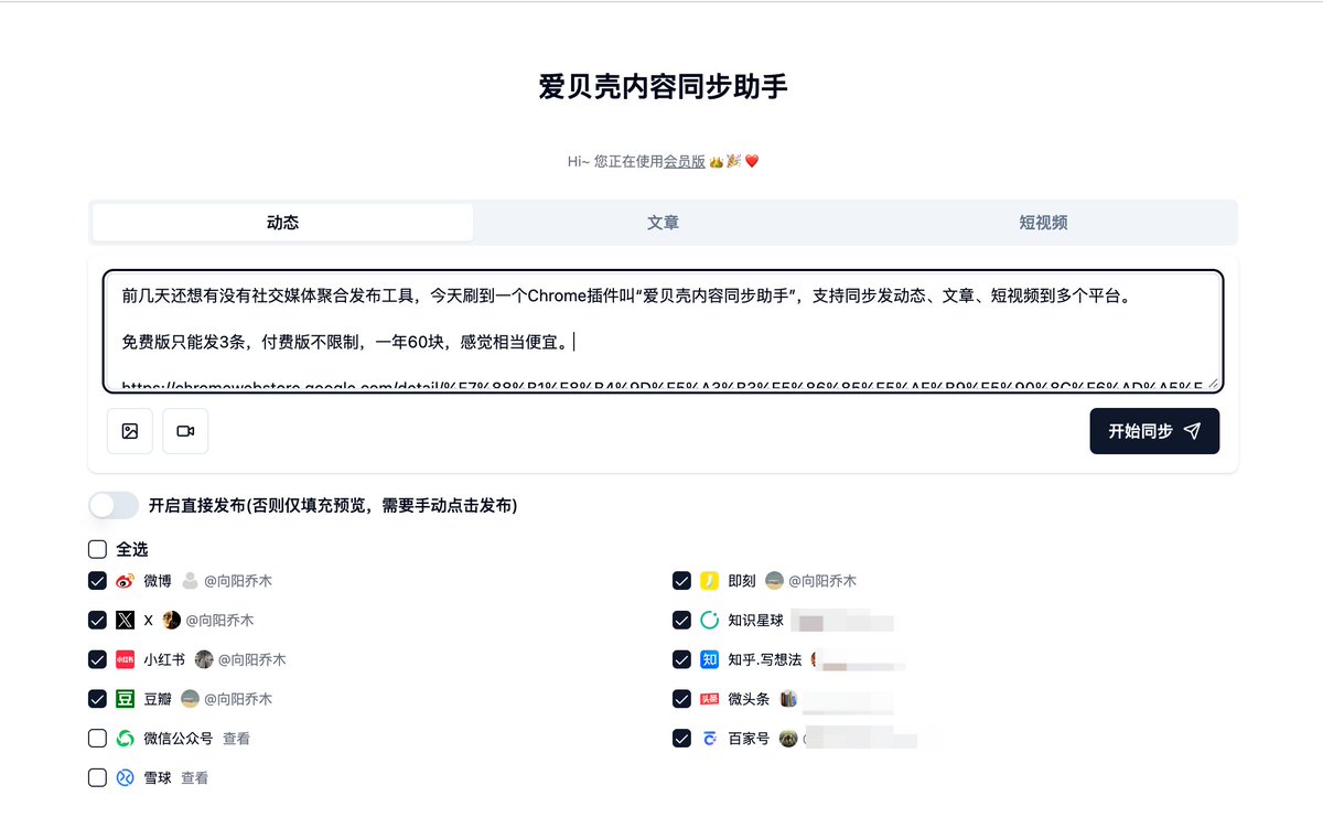 前几天还想有没有社交媒体聚合发布工具,今天刷到一个Chrome插件叫“爱贝壳内容同步助手”,支持同步发动态、文章、短视频到多个平台。