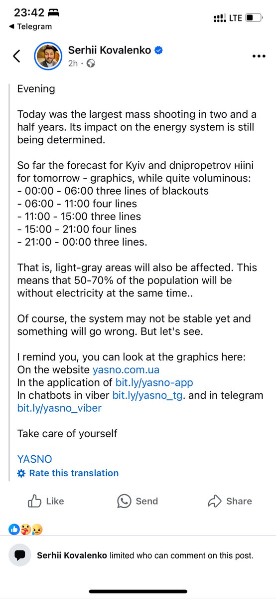 明天在基辅,50-70% 的消费者将同时断电——Yasno 首席执行官😔😔😔 https://t.co/OPBBUnEuop