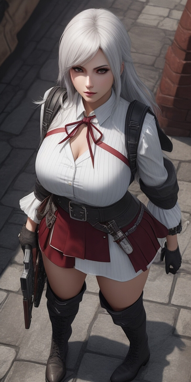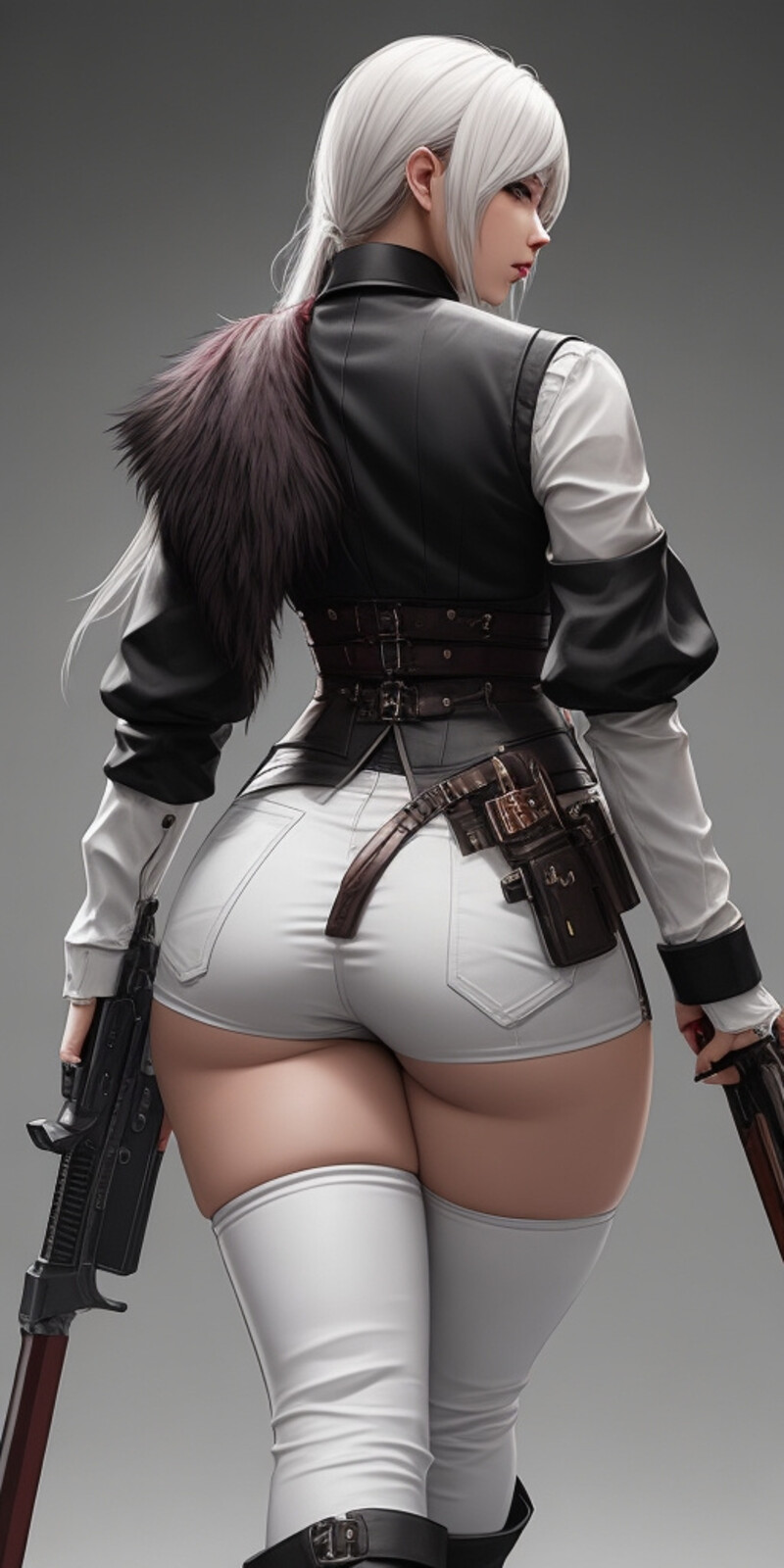 Prompt: a woman with a gun walking down a street, a character portrait, cgsociety contest winner, renaissance, she has a jiggly fat round belly, female outfit, sakimichan, dignified aristocrat, thicc, small curvy loli, old west, alluring plus sized model, (gears), maid outfit, tifa lockheart, large hips