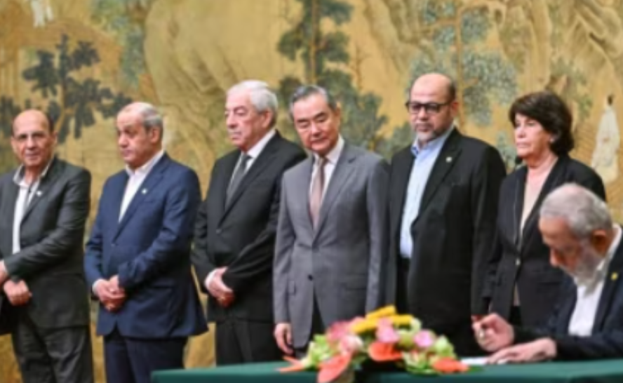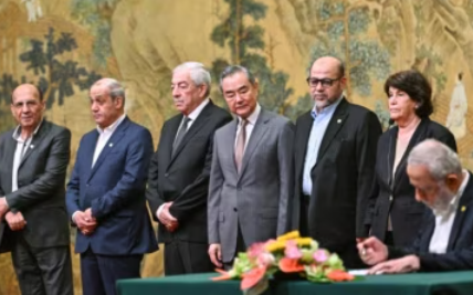 巴勒斯坦各派代表签署关于结束分裂、加强巴勒斯坦团结的《北京宣言》。