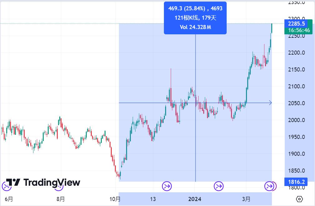 去年10月7号,黄金最低跌至1816,当时所有人都在预测会跌破1800,距离我的爆仓线只有30,那几周我彻夜难眠,接近绝望,然后听到了哈马斯突袭以色列的消息,中东战争开始了,我立刻意识到得救了!