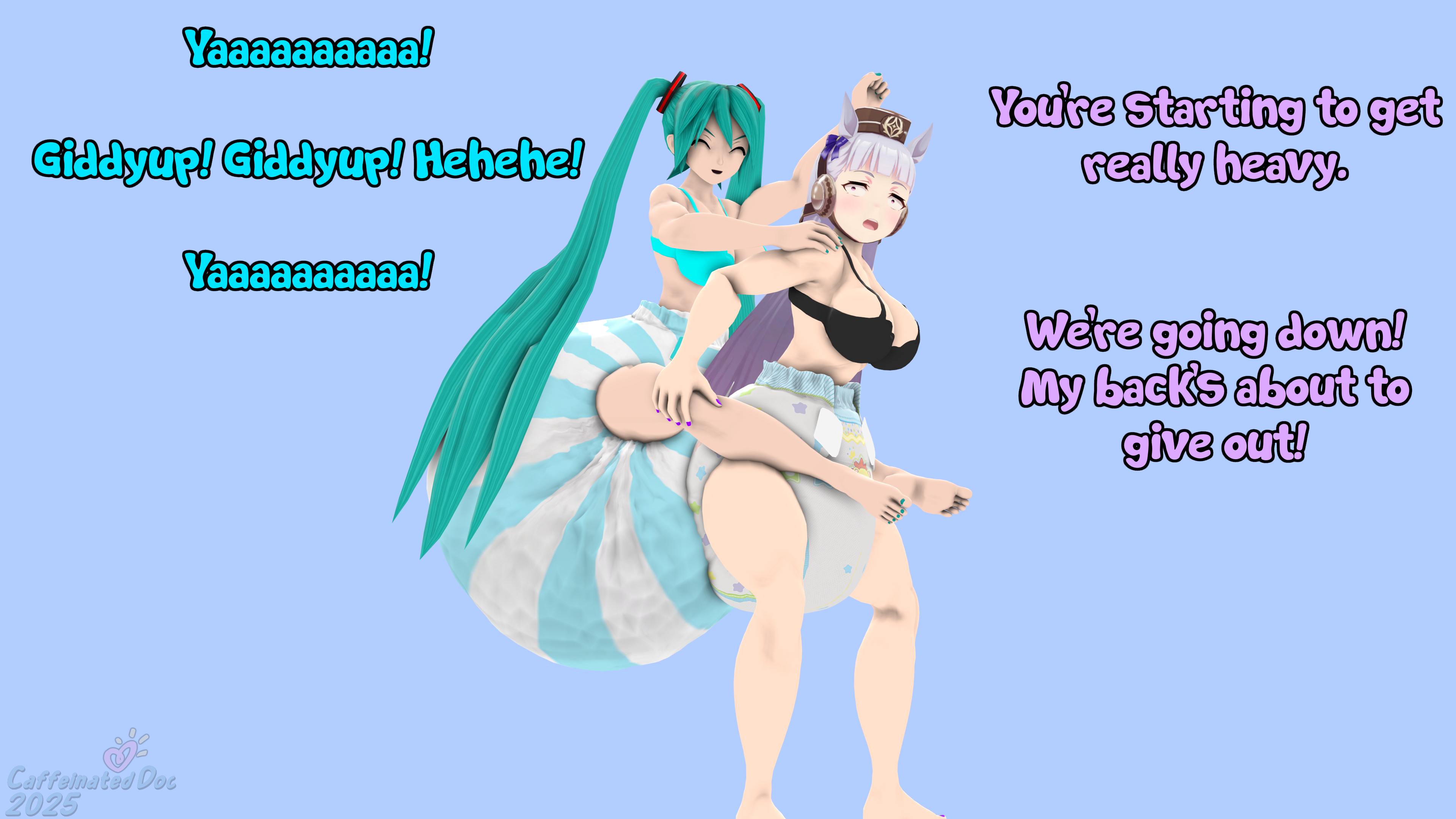 I have been obligated to do Goldship giving everyone's favorite robo-idol known as Hatsune Miku a piggyback ride. But, as it turns out, Goldship is about to give out while Miku is putting some extra weight in her diaper.
