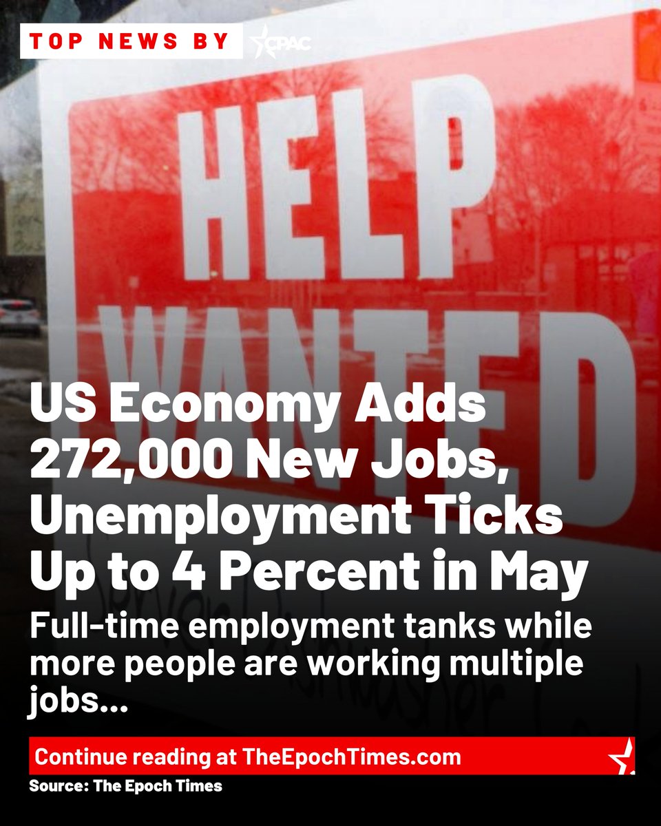 Top News: US Economy Adds 272,000 New Jobs, Unemployment Ticks Up to 4 Percent in May