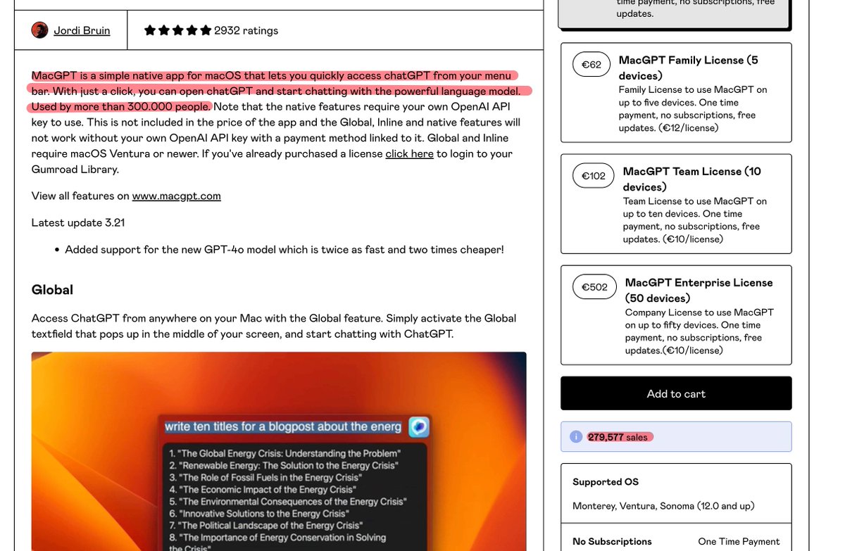 #逛gumroad发现这么个产品 卖了$5M,我还没仔细看,感觉就是一个mac上的gpt客户端?果然低调赚钱的人是不会到处说的,比X上的当红炸子鸡Marc Lou还牛逼啊.....