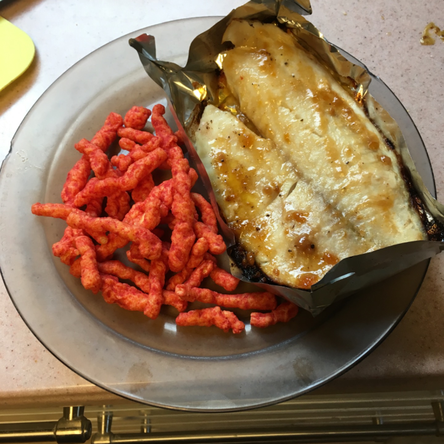 Anyone want apricot glazed fish fillets and flaming hot Cheetos?