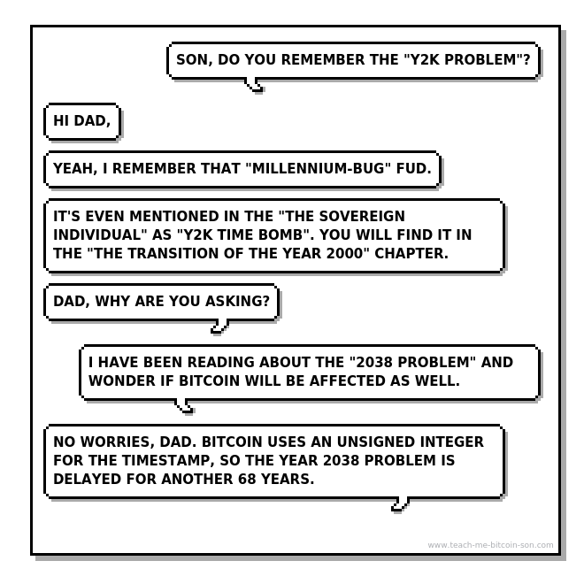 Son: No worries, Dad. Bitcoin uses an unsigned integer for the timestamp, so the year 2038 problem is delayed for another 68 years.