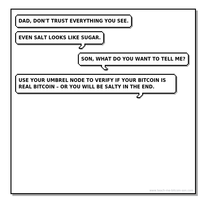 Son: Use your Umbrel node to verify if your bitcoin is real bitcoin – or you will be salty in the end.