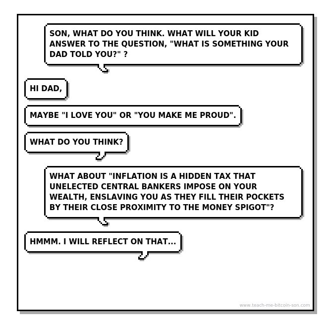 Dad: What about "Inflation is a hidden tax that unelected Central Bankers impose on your wealth, enslaving you as they fill their pockets by their close proximity to the money spigot"?