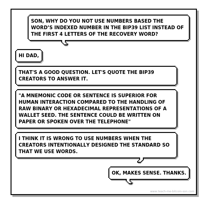 Dad: Son, why do you not use numbers based the word’s indexed number in the BIP39 list instead of the first 4 letters of the recovery word?