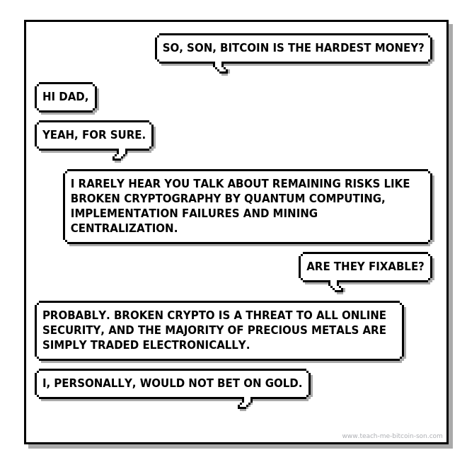 Dad: I rarely hear you talk about remaining risks like broken cryptography by Quantum Computing, Implementation failures and mining centralization.