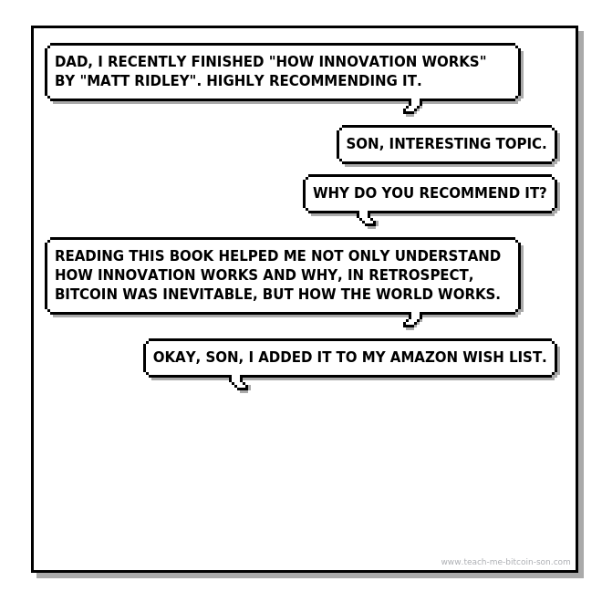 Son: Dad, I recently finished "How Innovation Works" by "Matt Ridley". Highly recommending it.