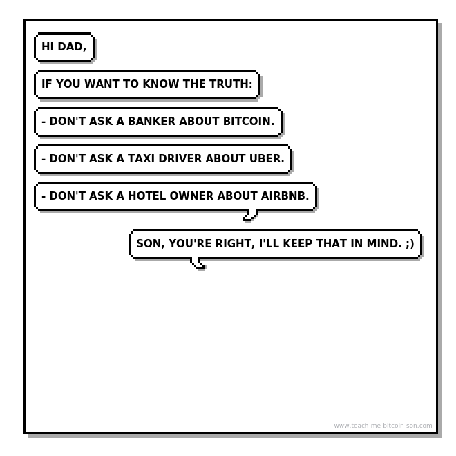 Dad: Son, I met my banker and asked him about Bitcoin. He is not convinced and said it will go to zero.