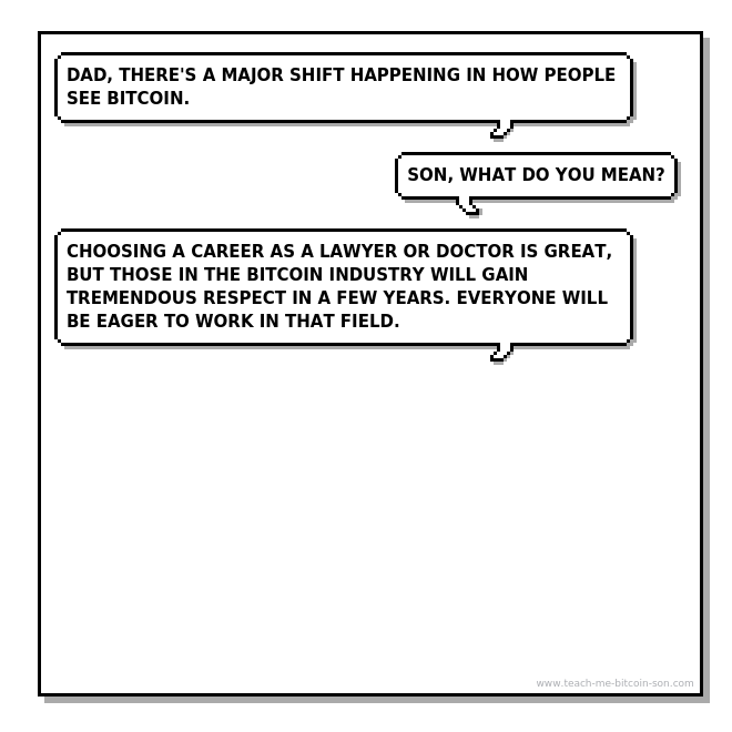 Son: Choosing a career as a Lawyer or Doctor is great, but those in the Bitcoin industry will gain tremendous respect in a few years. Everyone will be eager to work in that field.